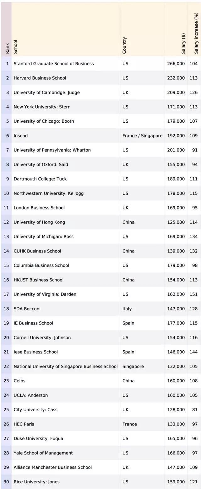 榜单数据显示,香港3间大学MBA学生毕业后3年的平均年薪较修读课程前皆上升至少一倍,平均年薪以科大最高,达15.4万美元(约119万港元),较就读MBA前上升113%;中大MBA毕业平均年薪则有13.9万美元(约108万港元),增幅达132%,属3间院校中最大。港大MBA毕业平均年薪亦有12.5万美元、即约97万港元,增幅为114%。