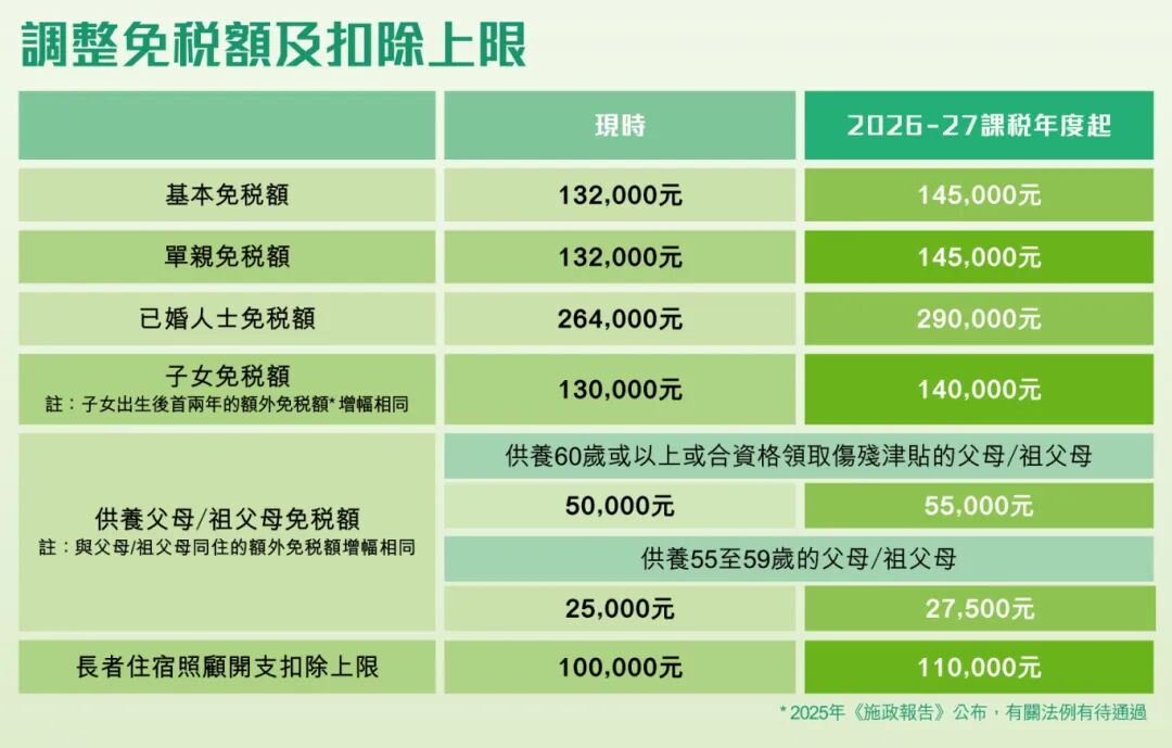 与此同时,《财政预算案》官宣从2026/27课税年度起,调高基本、单亲、已婚人士、子女、供养父母/祖父母免税额,并增加长者住宿照顾开支的扣除上限!进一步减少纳税人的税负压力。
